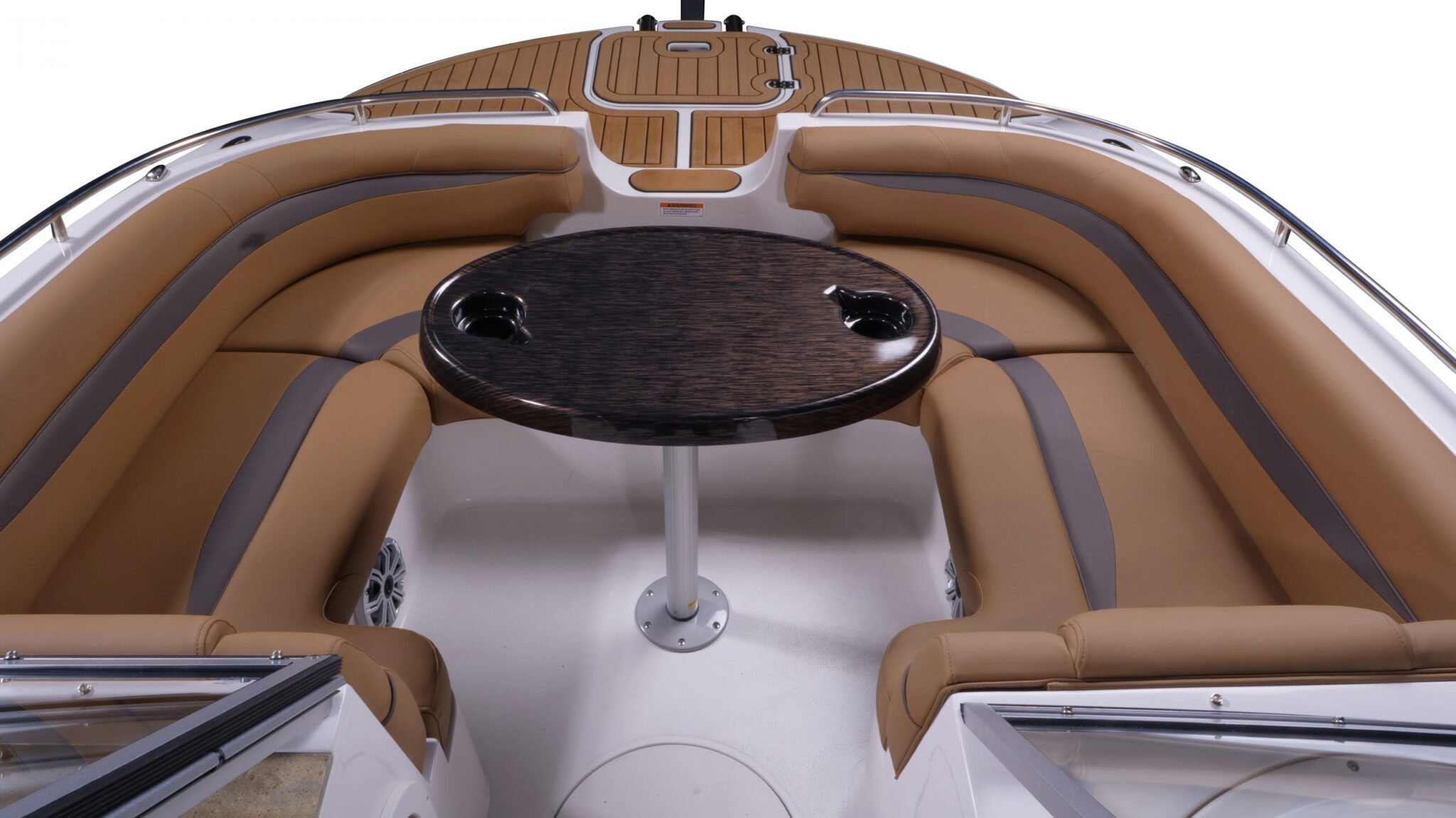 Rounded lounging sofas and a removable table at the bow.